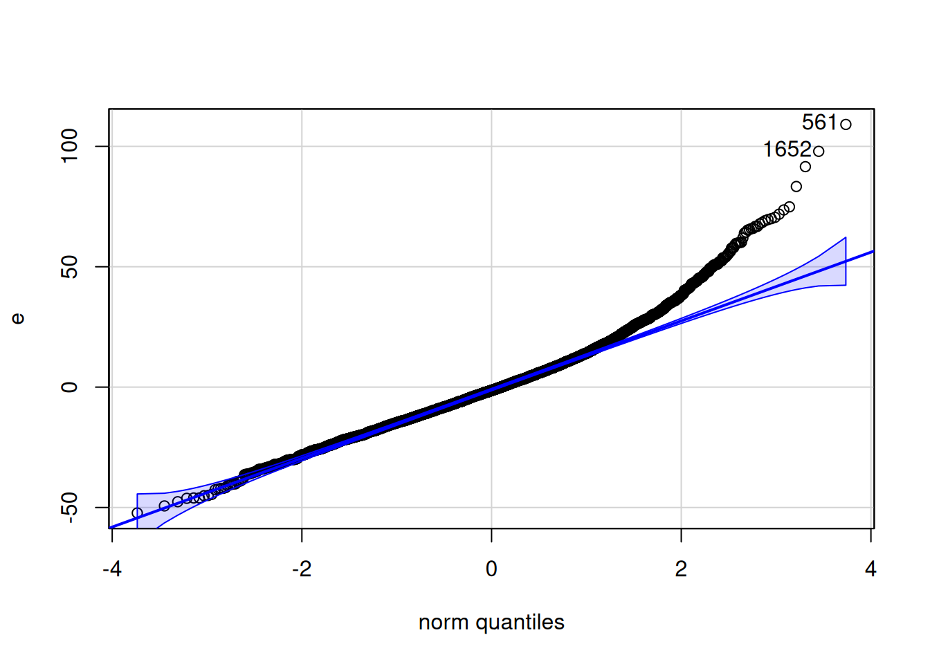 La figura a continuación nos sugiere una posible No normalidad, ocasionada por ese ligero desvío en la parte superior del gráfico (Los puntos deberían estar lo más alineados posible).
