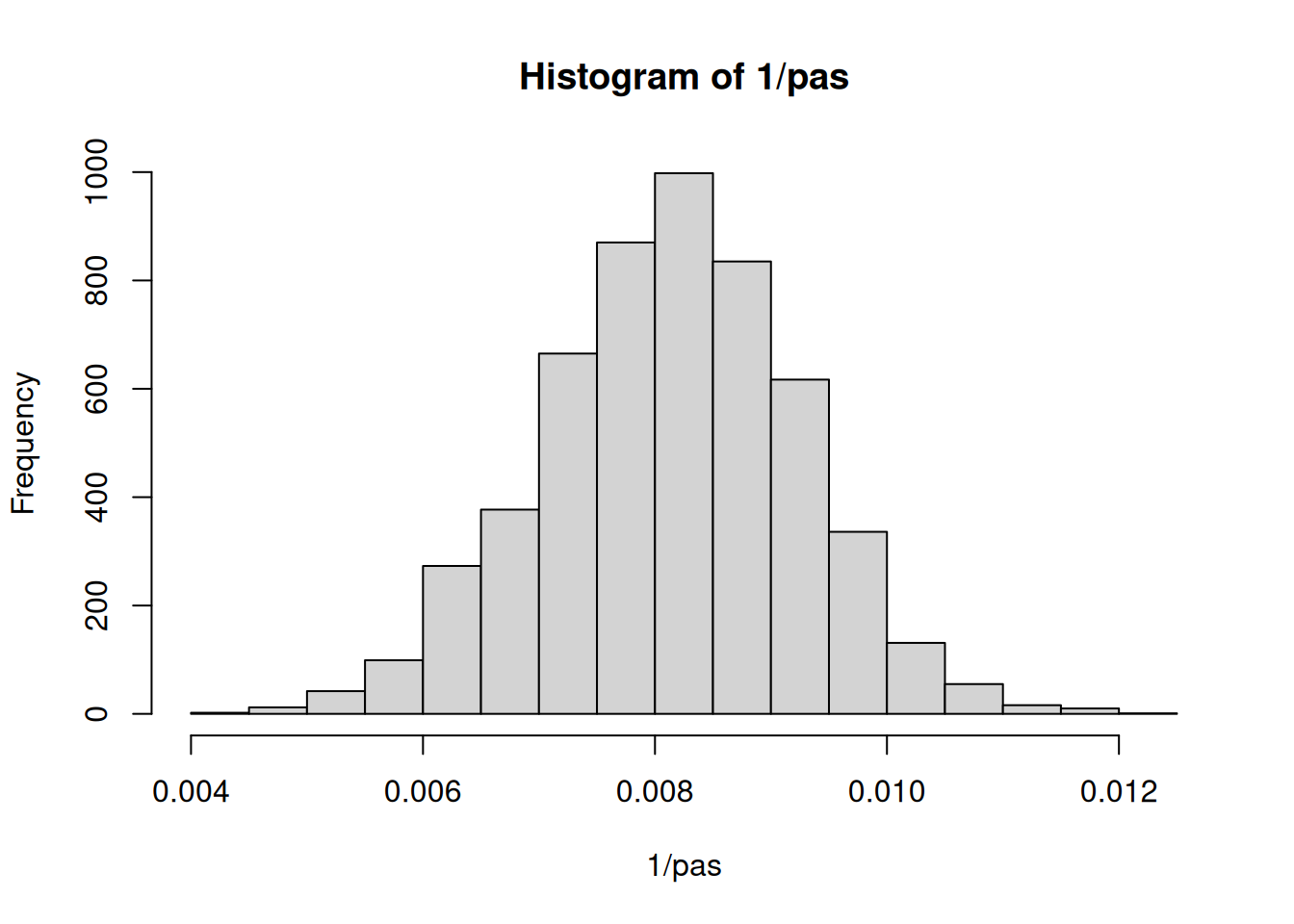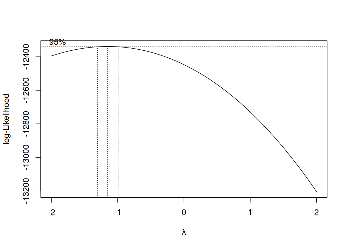 La Figura 11 nos insinúa que el valor de \(\lambda \approx -1\), en tal caso, la transformación que se debería usar es \(\dfrac{1}{PAS}\). De igual forma, es útil saber el valor puntual de \(\lambda\).