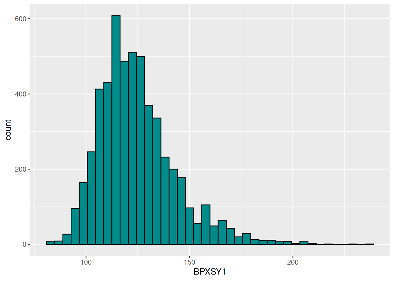 library(ggplot2)dbx %>%ggplot(aes(x = BPXSY1)) +geom_histogram(color ="black", fill ="Cyan4", bins =40)