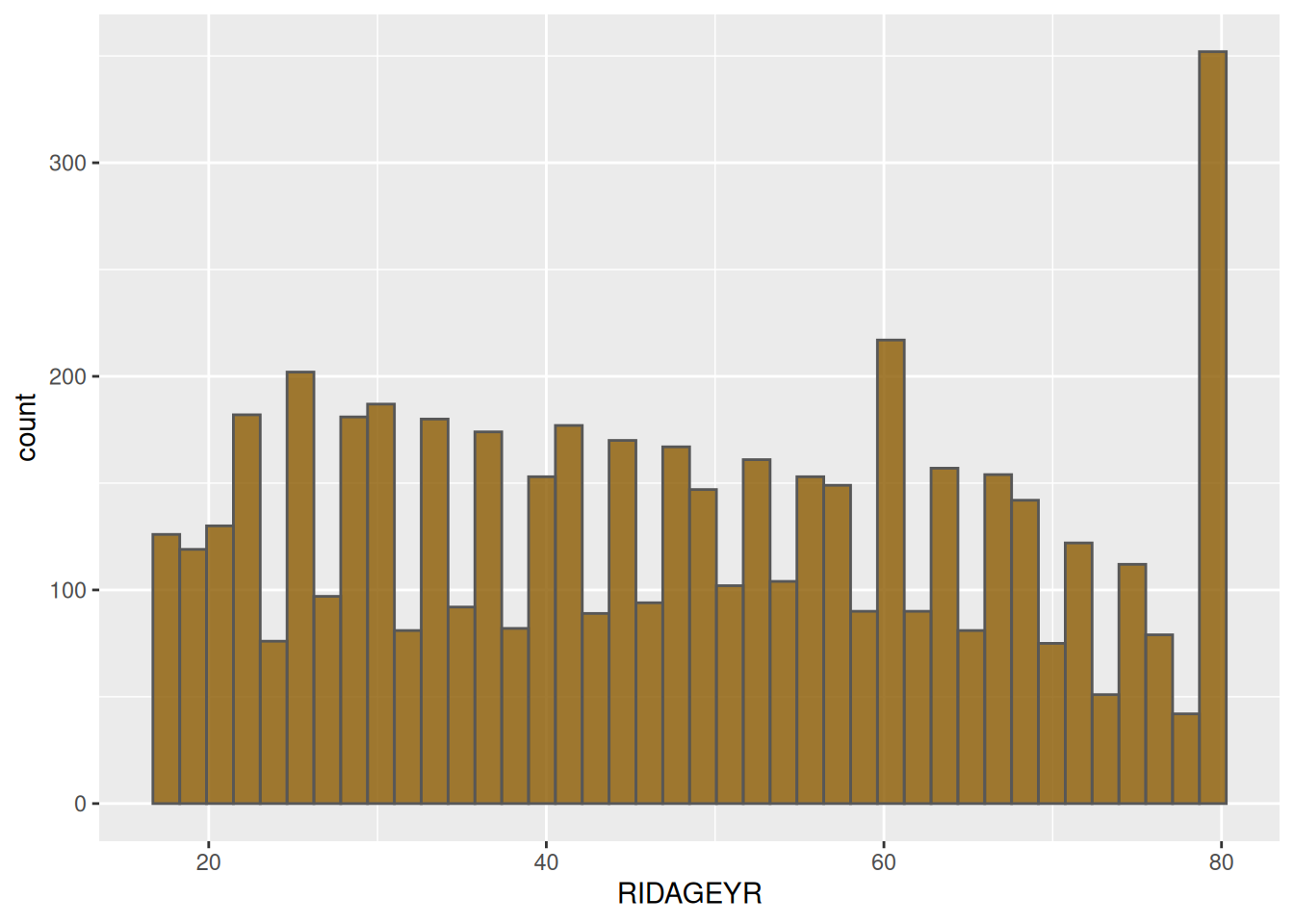 RIDAGEYR: Variable cuantitativa continua. Edad en años del participante en el momento del control, expresada en años. Las personas de 80 años o más se codifican con 80 años