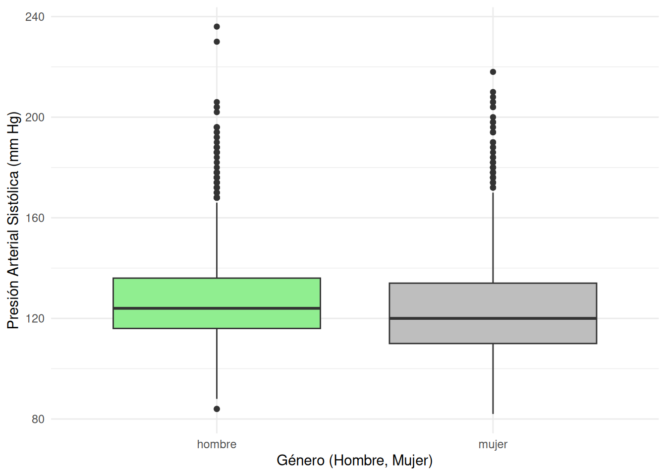 A simple vista (en el siguiente gráfico), los hombres presentan presiones sistólicas superiores a las de las mujeres, pero estas últimas tienen una mayor variabilidad (así como rango) en los niveles de presión arterial sistólica; sin embargo, esto último podría obedecer a factores que no estan representados en el gráfico.