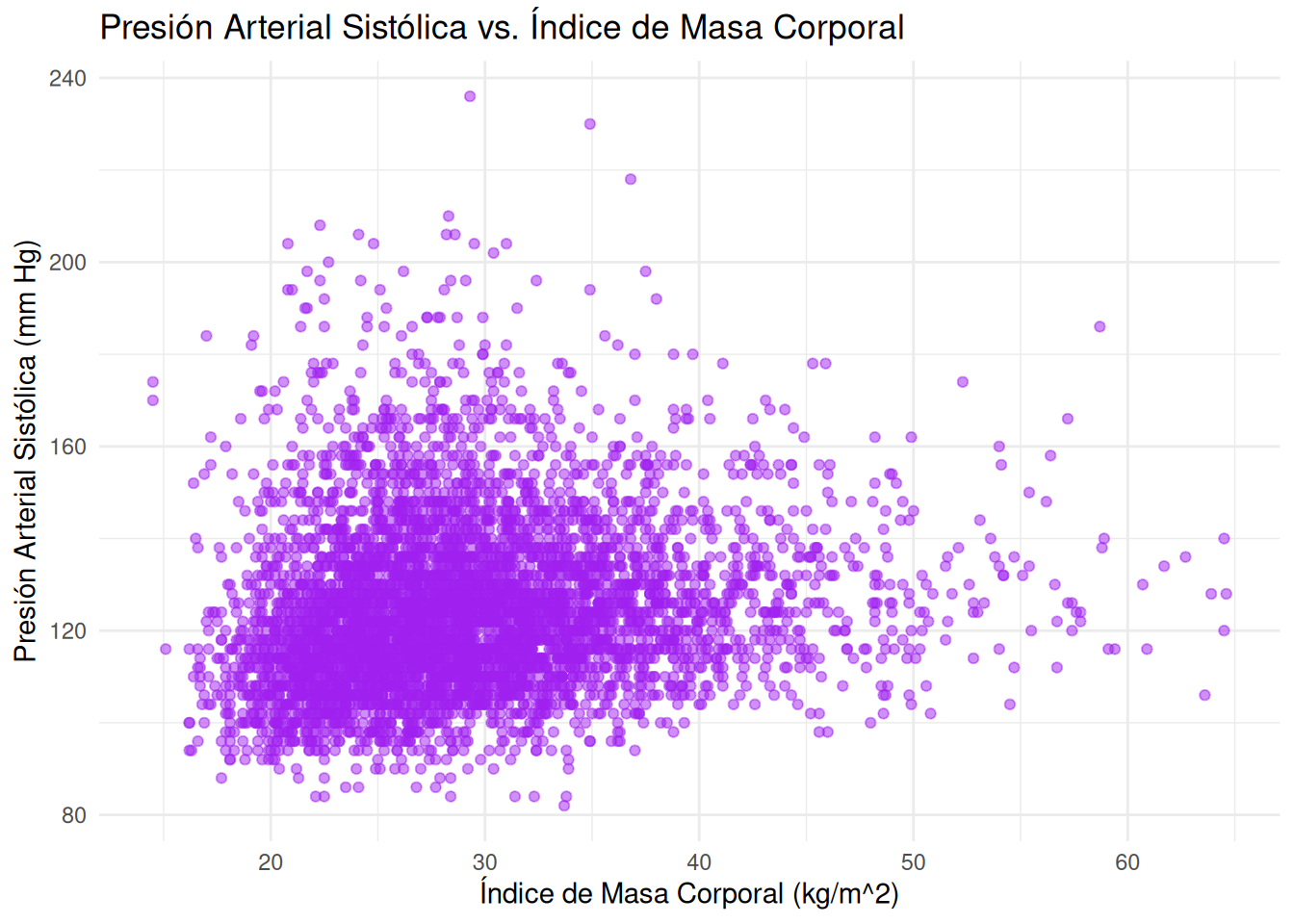 ggplot(dbx, aes(x = BMXBMI, y = BPXSY1)) +geom_point(color ="purple", alpha =0.5) +labs(title ="Presión Arterial Sistólica vs. Índice de Masa Corporal",x ="Índice de Masa Corporal (kg/m^2)",y ="Presión Arterial Sistólica (mm Hg)") +theme_minimal()