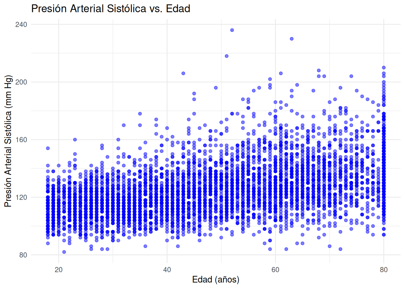 En la siguiente figura también se observa una aparente relación lineal positiva entre la edad y la presión arterial sistólica. Una posible explicación de este fenómeno podría ser la mayor prevalencia del uso de medicamentos, incluidos los antidepresivos, que tiende a aumentar con la edad (Landahl, et al., 1986).